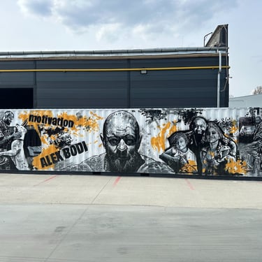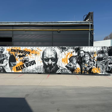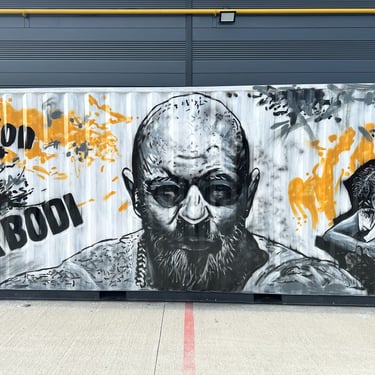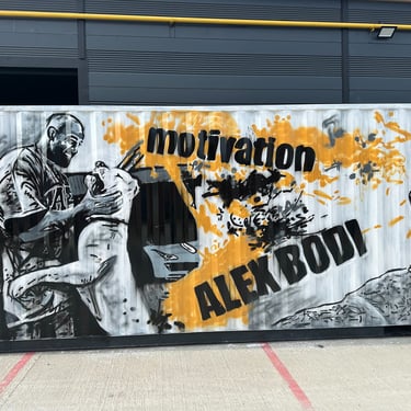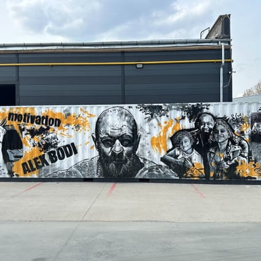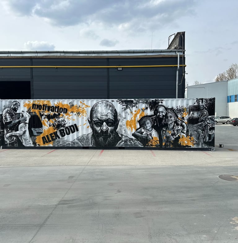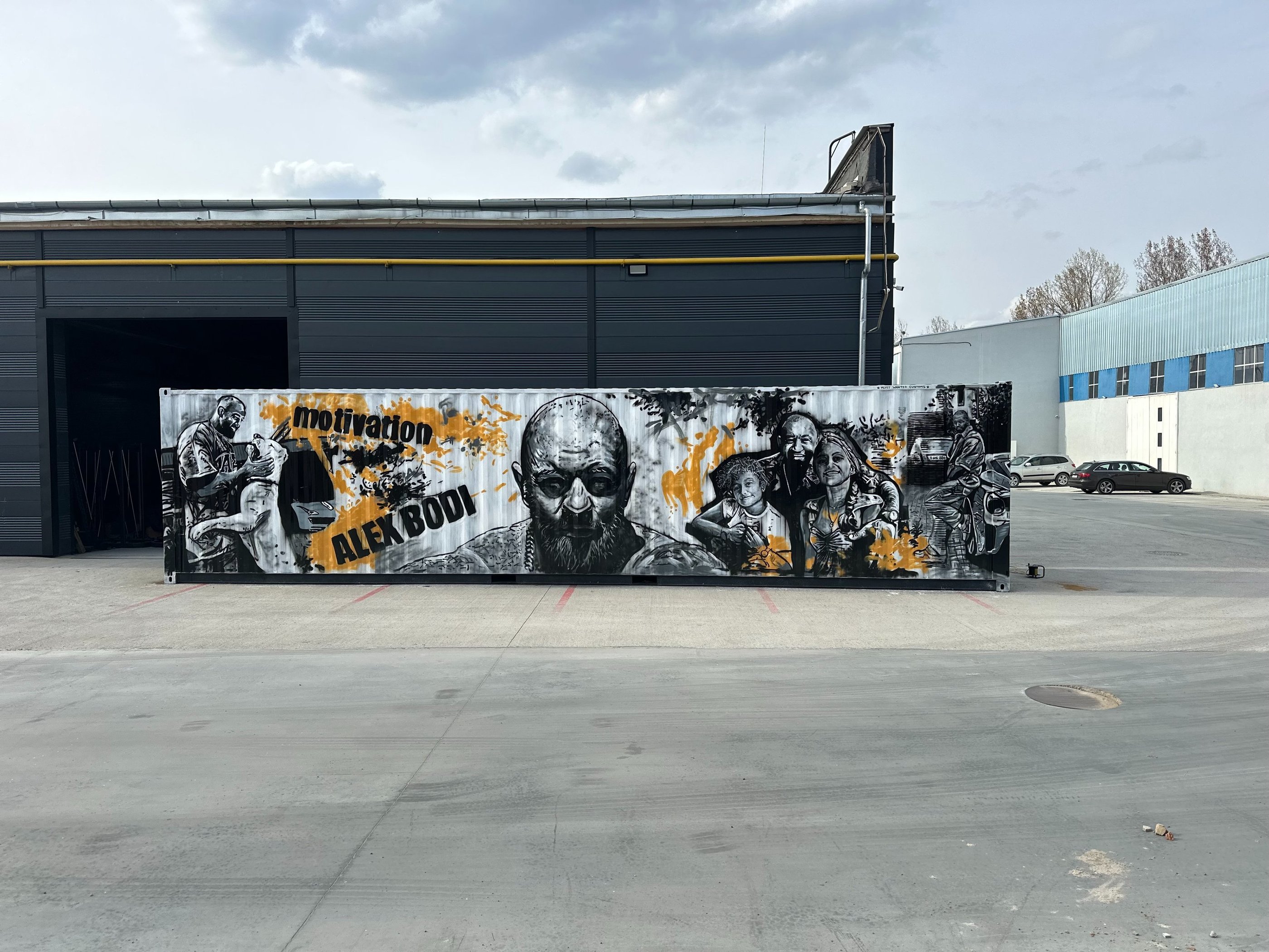 Am facut aceasta lucrare in aproximativ o saptamana si este o onoare pentru noi sa facem parte din acest proiect. Containerul va avea utilitatea de sala de fitness si este conceput special pentru Alex Bodi de catre prietenul lui Adi Dragos care detine mai multe sali de fitness si importa toata gama de aparate. Un concept special, facut de oameni speciali, pentru oameni speciali. In alta ordine de idei unii ar fi tentati sa spuna ca l-am pictat in ilustratia din mijloc cu cearcane si ca pare obosit. In realitate insa, adevarul este ca in poza folosita in design-ul propus, soarele bate de sus, iar umbra este foarte pronuntata. Daca ne uitam atent, nu doar ochii ci si nasul are cearcane, pardon, umbra! :) he he, Numai de bine!