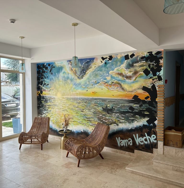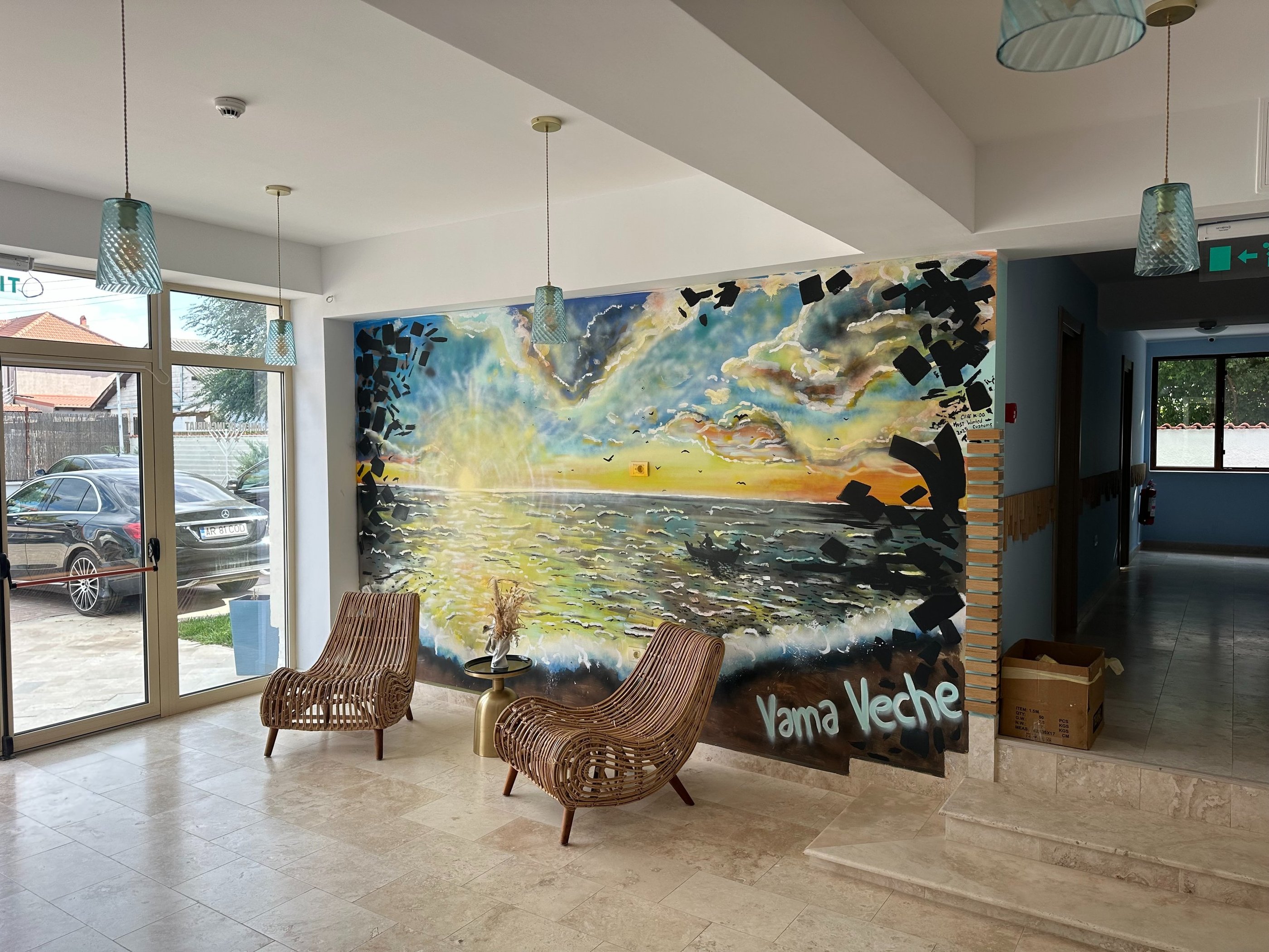 Ajungând în Vama Veche în anul 2025, am pictat acest perete în recepția Hotelului PoluX. Proprietara și-a dorit un peisaj specific zonei geografice, iar în urma unei discuții am căzut de acord în privința design-ului și ulterior a simulării. Am inventat un set-up simplu cu pensule cumpărate de la depozitul lor de materiale de construcții, câțiva pigmenți de lavabil, câteva spray-uri Duplicolor, exact ca pe vremuri. Șase ore mai târziu aveam lucrarea aceasta gata, folia de protecție deja strânsă, curățenie făcută, iar fotoliile și măsuța erau înapoi la locul lor. Reacția beneficiarei, dar și a turiștilor care au trecut pe acolo în timpul executării picturii, a fost pozitivă.
